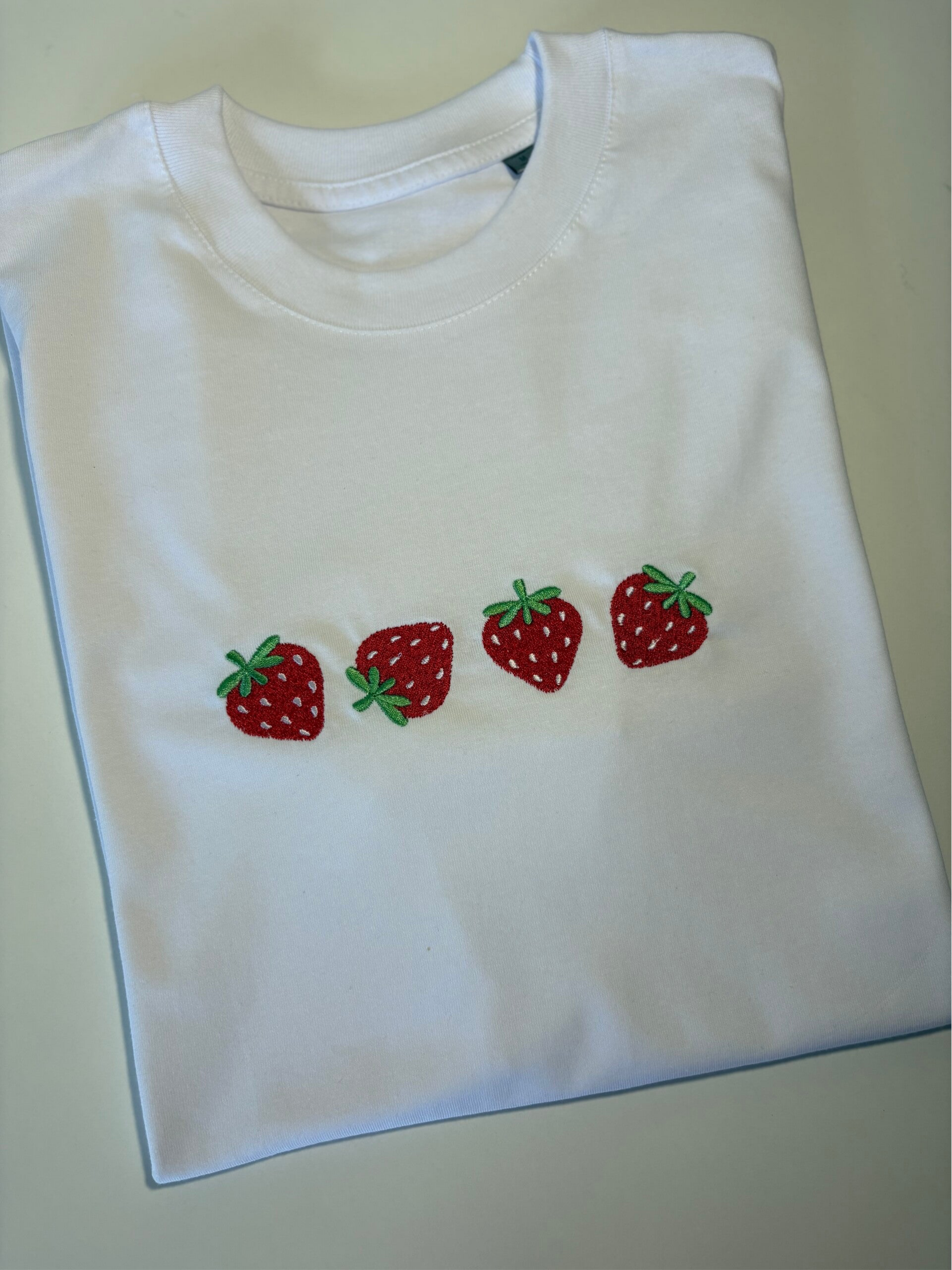 A gorgeous embroidered strawberry tee, team it with a pair of jeans for lovely summery look.